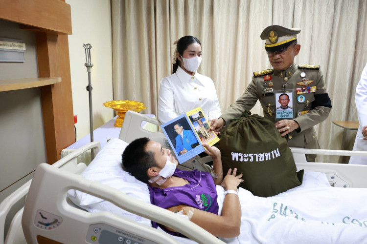 สงขลา-พระบาทสมเด็จพระเจ้าอยู่หัว และสมเด็จพระนางเจ้าฯ พระบรมราชินี โปรดเกล้าฯ ให้องคมนตรี เชิญสิ่งของพระราชทาน จำนวน 5 ชุด เยี่ยมเจ้าหน้าที่ที่ได้รับบาดเจ็บจากเหตุการณ์ความไม่สงบ ในพื้นที่จังหวัดชายแดนภาคใต้ที่โรงพยาบาลสงขลานครินทร์