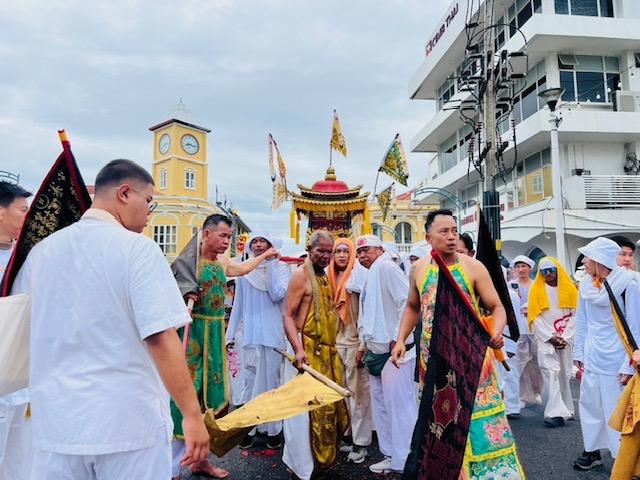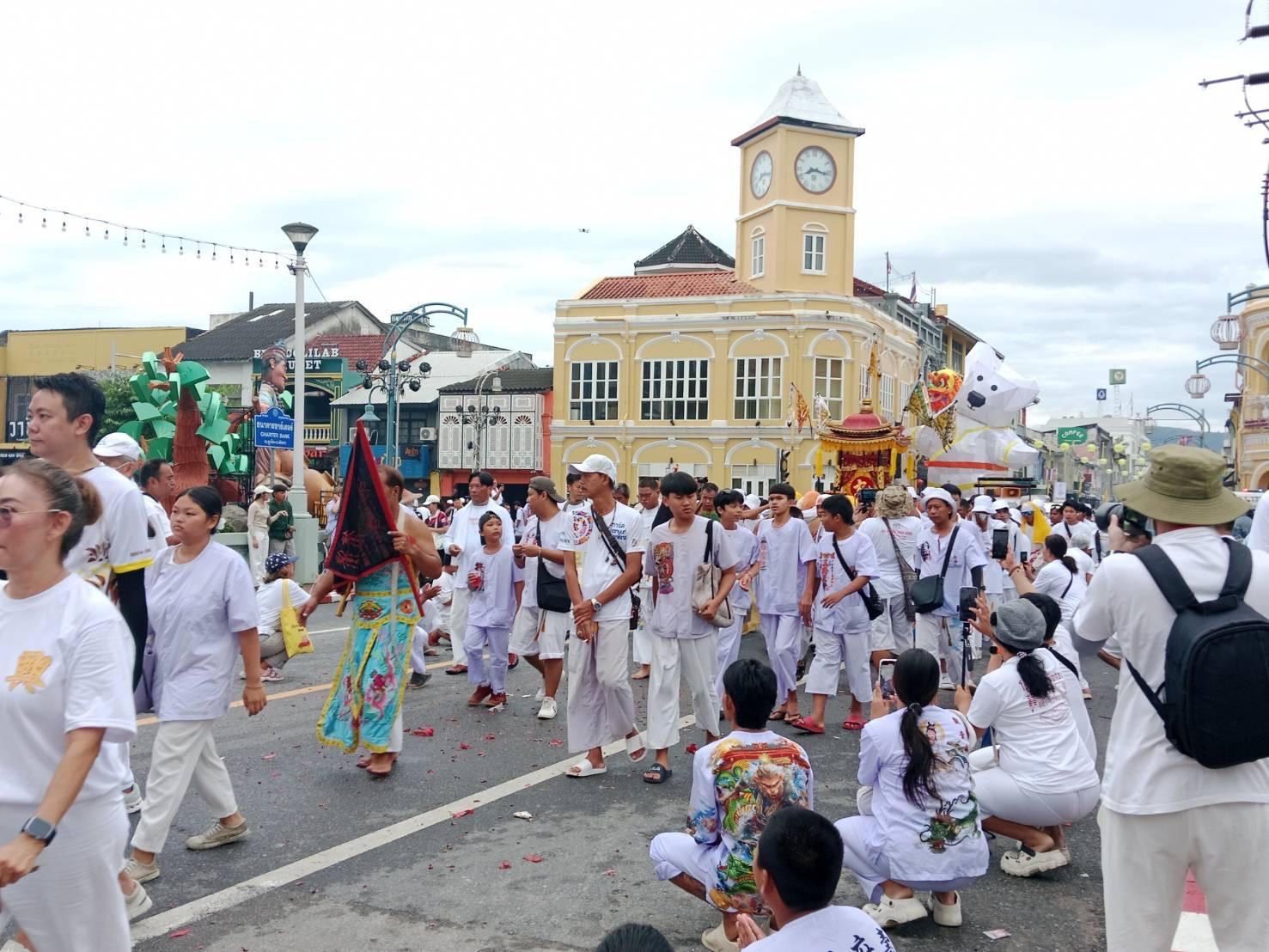 เมื่อวันที่ 24 ต.ค.68 เวลา 07.09 น. ซึ่งเป็นวันที่ 4 ของประเพณีถือศีลกินผัก หรือ เจี๊ยะฉ่ายภูเก็ต ประจำปี 68 และเป็นวันที่ 3 ของการประกอบพิธี "อิ้วเก้ง" หรือ แห่พระรอบเมืองภูเก็ต ซึ่งศาลเจ้าหลิมฮู้ไท้ซู่ (สามกอง) ซึ่งตั้งอยู่บนถนนเยาวราช ต.ตลาดใหญ่ อ.เมืองภูเก็ต หนึ่งในศาลเจ้าหรืออ๊ามที่เก่าแก่ของ จ.ภูเก็ตประทับทรงองค์เทพให้แก่เหล่าม้าทรง เพื่อใช้ศาสตราวุธและอาวุธชนิดต่างๆ ทั้งในและนอกตำนานประเพณีทิ่มแทงกระพุ้งแก้ม ลิ้นและตามร่างกาย เพื่อเป็นการรับเคราะห์แทนประชาชนที่เข้าร่วมประเพณีถือศีลกินผักออกเดินเท้าจากศาลเจ้าไปยังปลายแหลมสะพานหิน โดยผ่านถนนสายหลักกลางเมืองภูเก็ต เพื่อให้ประชาชนและนักท่องเที่ยวได้สัมผัสความศักดิ์สิทธิ์และอภินิหารของเหล่าม้าทรง ขณะที่บริเวณสี่แยกธนาคารชาร์เตอร์ แลนด์มาร์กย่านเมืองเก่าภูเก็ตเนืองแน่นไปด้วยประชาชนและนักท่องเที่ยวที่มารอดูขบวนและถ่ายรูปเหล่าม้าทรงไว้เป็นระลึก 1 ปีมีหน.