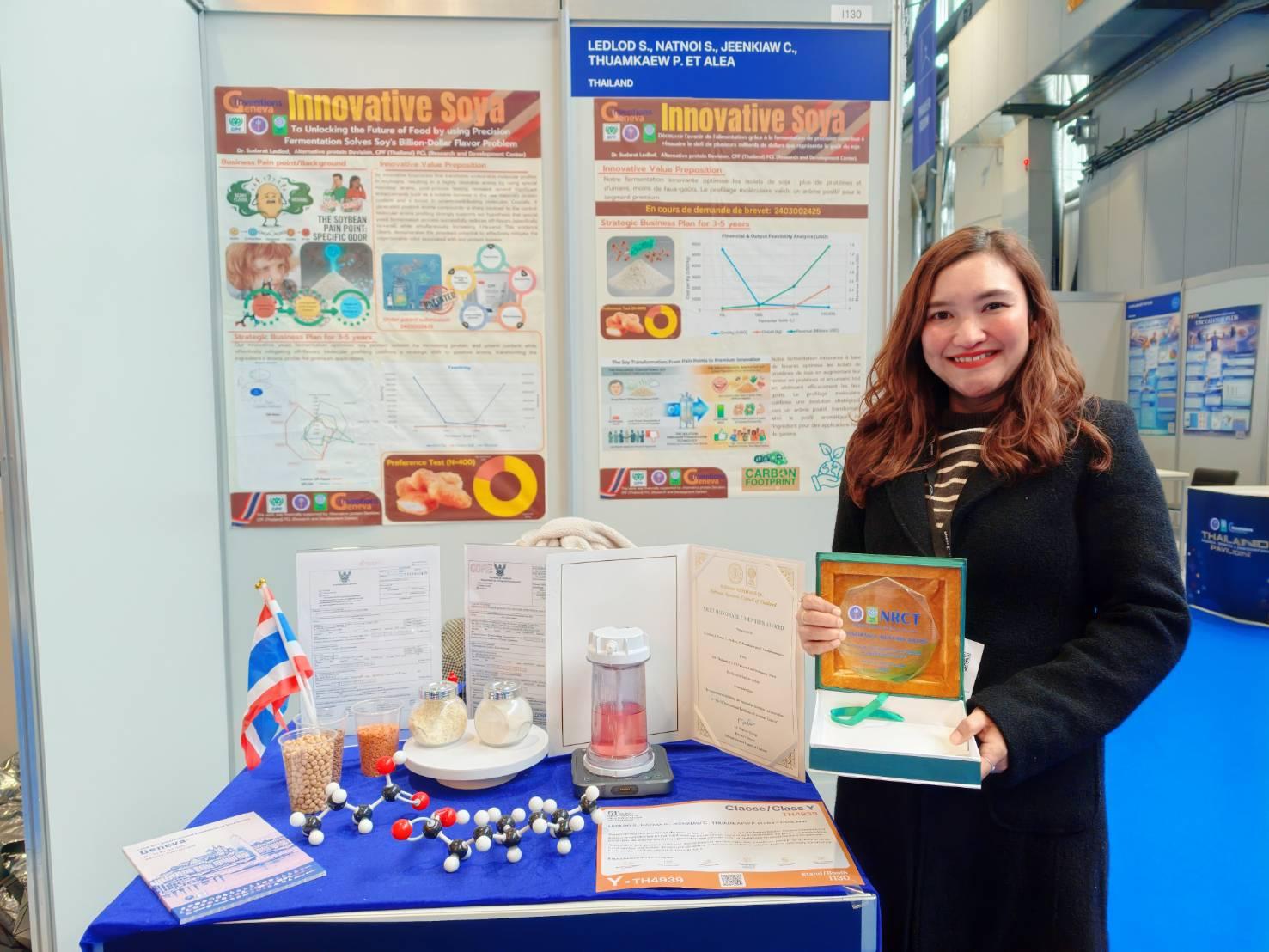 สำหรับนวัตกรรม “โปรตีนถั่ว-เหลืองแบบใหม่” (Innovative Soya) ช่วยลดปัญหาเรื่องกลิ่นถั่ว ทำให้ผู้บริโภครับประทานได้ง่ายขึ้น พร้อมเพิ่มความน่ารับประทานและระดับโปรตีนในวัตถุดิบ จึงสามารถนำไปต่อยอดสู่ผลิตภัณฑ์ plant-based ให้มีรสชาติที่ดีและยังคงคุณค่าทางโภชนาการ ตอบโจทย์ผู้บริโภคยุคใหม่ เป็นผลงานที่ได้รับรางวัล Honorable Mention จากสำนักงานการวิจัยแห่งชาติ (วช.) มาด้วยก่อนที่จะคว้าเหรียญทองในระดับโลก โดยมี ดร.สุดารัตน์ เล็ดลอด หัวหน้าทีมวิจัยโปรตีนทางเลือก สำนักวิจัยโปรตีนทางเลือก CPF RD Center เป็นหัวหน้าทีมวิจัย