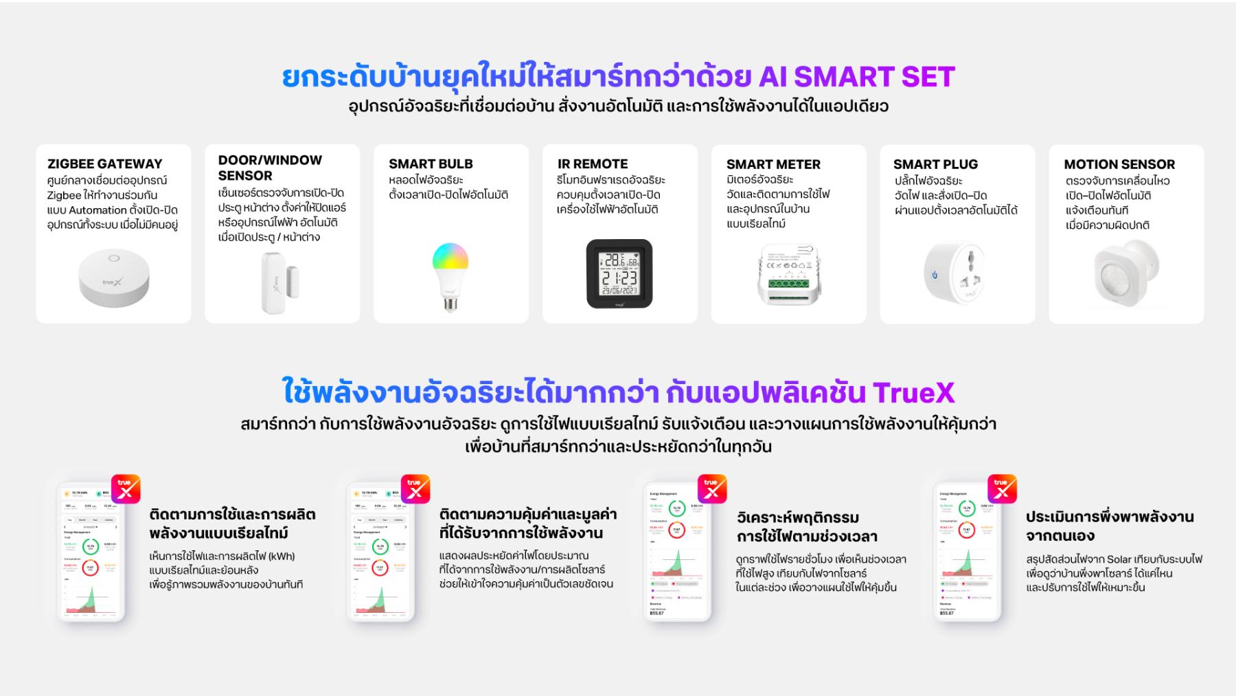 - Intelligence through AI: ยกระดับจากโซลาร์ทั่วไปสู่ระบบอัจฉริยะด้วย AI Smart Set และแอปพลิเคชัน TrueX ที่เชื่อมต่ออุปกรณ์ภายในบ้านเข้าด้วยกัน
