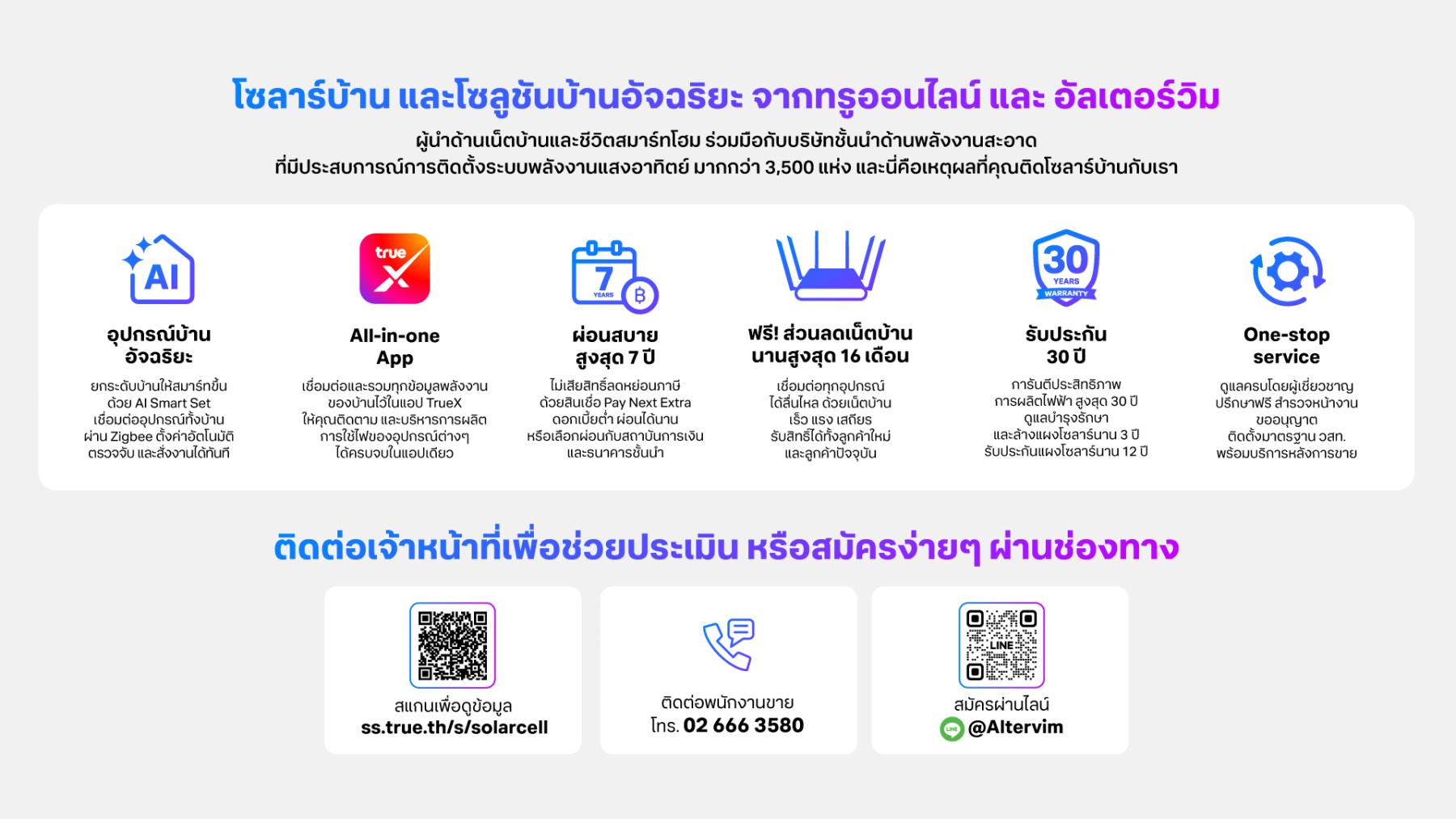 พบกับ ราคาพิเศษผ่อนเริ่มต้นเพียง 1,648 บาทต่อเดือน พร้อมบริการสินเชื่อ ผ่อนนานสูงสุด 7 ปีและยังได้รับสิทธิ์ในการลดหย่อนภาษีสูงสุด 200,000 บาทไปพร้อมกันอีกด้วย เพื่อมอบความคุ้มค่าสูงสุดให้ครัวเรือนไทยได้เริ่มต้นชีวิตยุคใหม่ในบ้านพลังงานอัจฉริยะที่ยั่งยืน ทรูออนไลน์และ Altervim พร้อมแล้วที่จะเป็นจิ๊กซอว์ชิ้นสำคัญในการเชื่อมโยงเทคโนโลยีอินเทอร์เน็ต อุปกรณ์สมาร์ทดีไวซ์ และพลังงานสะอาด ให้กลายเป็นเนื้อเดียวกันเพื่อคุณภาพชีวิตที่ดีกว่าของคนไทย