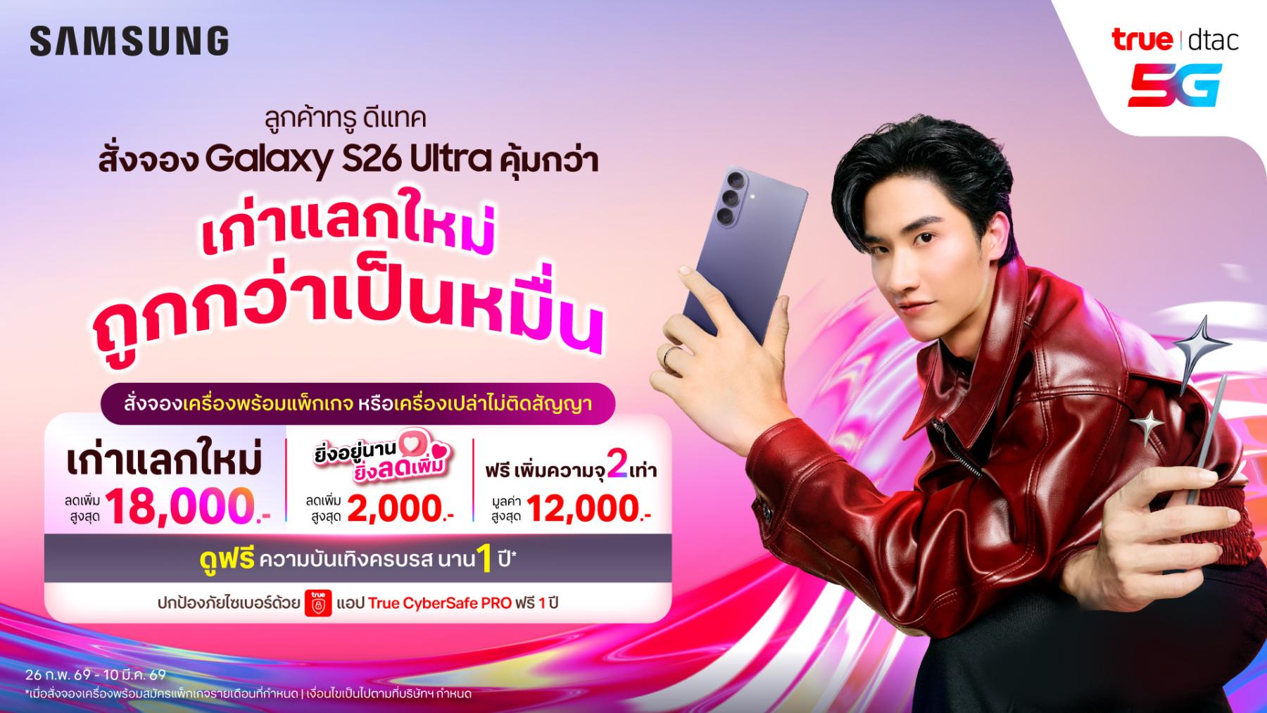 กรุงเทพฯ - เมื่อวันที่ 26 กุมภาพันธ์ 2569 ทรู ดีแทค 5G ชวนคนไทย สั่งจองเอไอโฟนเรือธงรุ่นใหม่ Samsung Galaxy S26 Ultra ที่มาพร้อมกับ World’s First Privacy Display มือถือจอกันเผือกครั้งแรกของโลก รวมทั้งฟีเจอร์ AI และกล้องชัดทรงพลัง จัดเต็มตามแบบฉบับ Samsung พร้อมตอกย้ำความล้ำของเอไอโฟนรุ่นใหม่ไปกับ เต-ตะวัน วิหครัตน์ Co Presenter ตัวแทนคนรุ่นใหม่ ที่จะมาร่วมถ่ายทอดประสบการณ์ความคุ้ม บนเครือข่ายที่เร็ว แรง และปลอดภัยที่สุด ก่อนเค้า… ก่อนใคร