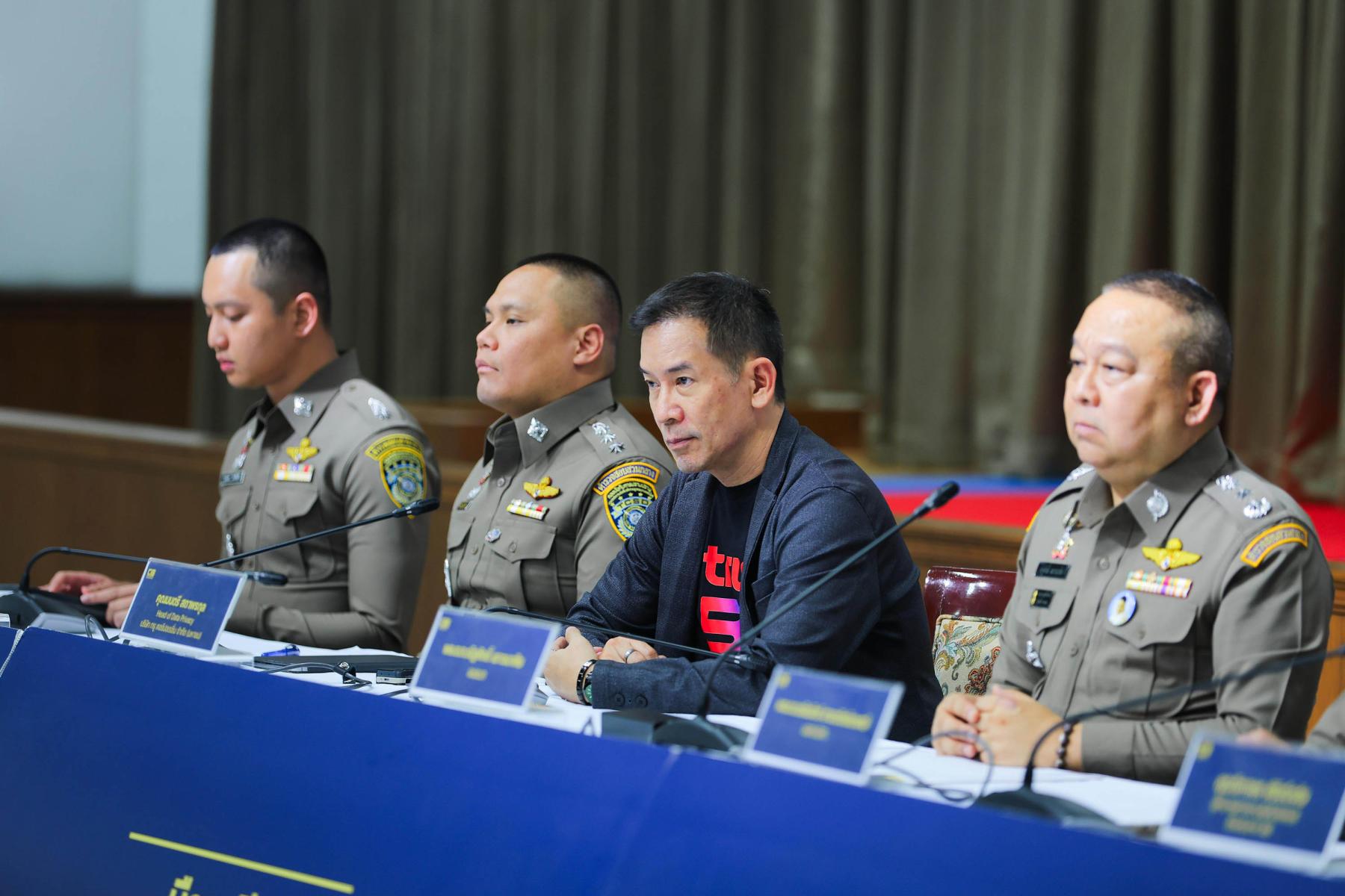 บรรยายภาพ : นายมนตรี สถาพรกุล หัวหน้าฝ่ายคุ้มครองข้อมูลส่วนบุคคล บริษัท ทรู คอร์ปอเรชั่น จำกัด (มหาชน) ตัวแทนบริษัทฯ ร่วมให้ข้อมูลเชิงเทคนิคและประสานความร่วมมือภายใต้กรอบกฎหมายที่เกี่ยวข้องกับ พล.ต.ท.ณัฐศักดิ์ เชาวนาศัย ผู้บัญชาการตำรวจสอบสวนกลาง (CIB) และ พล.ต.ต.ชนันนัทธ์ สารถวัลย์แพศย์ ผบก.ปอท. ในการบุกจับแก๊งคอลเซ็นเตอร์ จังหวัดสระแก้ว จากการตรวจพบพฤติกรรมผิดปกติจากการใช้งานมือถือโดยระบบเฝ้าระวังเครือข่ายอัจฉริยะของทรู