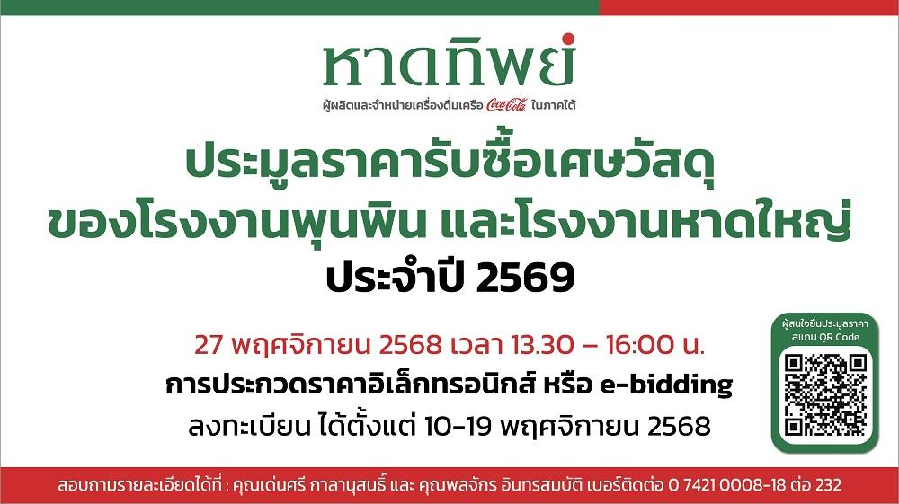 สงขลา - บริษัท หาดทิพย์ จำกัด (มหาชน) เปิดรับสมัครผู้เข้าร่วมประมูลราคาวัสดุส่งเสริมการขายและผู้รับซื้อเศษวัสดุ ประจำปี 2569 โดยมีคุณสมบัติดังนี้