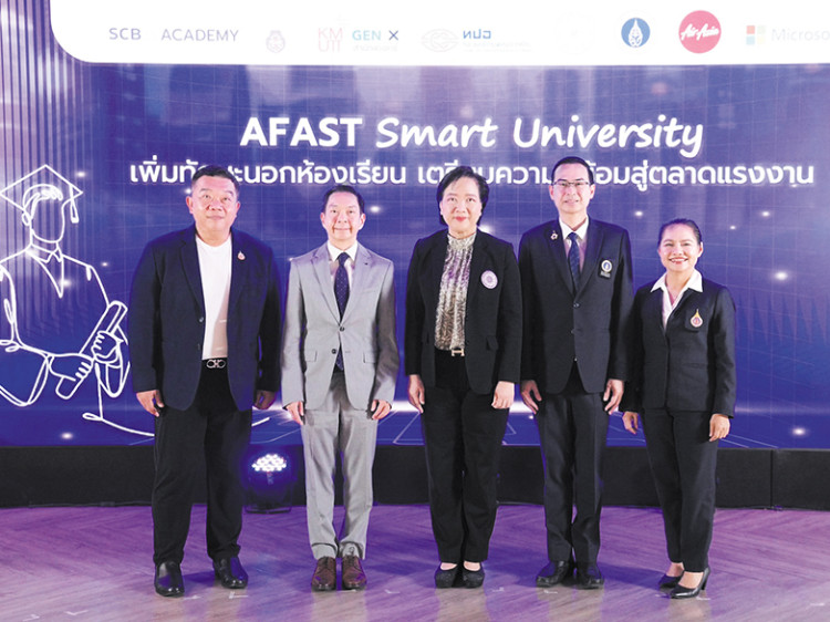กรุงเทพฯ - ธนาคารไทยพาณิชย์ โดย SCB Academy เดินหน้าสร้างแรงกระเพื่อมด้านการศึกษาไทย ผนึกกำลังพันธมิตรทั้งภาคการศึกษา และภาคเอกชน เปิดตัว “AFAST Smart University” ภายใต้แนวคิด “เตรียม เสริม เพิ่ม” บัณฑิตจะไม่ใช่แค่ ‘จบการศึกษา’ แต่พร้อม ‘เริ่มทำงาน’ ได้ทันที” โดยโครงการนี้เป็นการผนึกกำลังจากพันธมิตรสำคัญทั้งจากภาคการศึกษาและภาคเอกชน ได้แก่ ที่ประชุมอธิการบดีแห่งประเทศไทย (ทปอ.), สมาคมสถาบันอุดมศึกษาเอกชนแห่งประเทศไทย (สสอท.), มหาวิทยาลัยมหิดล, มหาวิทยาลัยวลัยลักษณ์, สำนักเคเอกซ์ มหาวิทยาลัยเทคโนโลยีพระจอมเกล้าธนบุรี (KMUTT), Thai AirAsia Academy, Microsoft (Thailand) เพื่อร่วมกันขับเคลื่อนยกระดับพัฒนาทักษะการเรียนรู้นอกห้องเรียนให้กับนิสิต นักศึกษา ให้สอดคล้องกับความต้องการของตลาดแรงงานที่แท้จริง