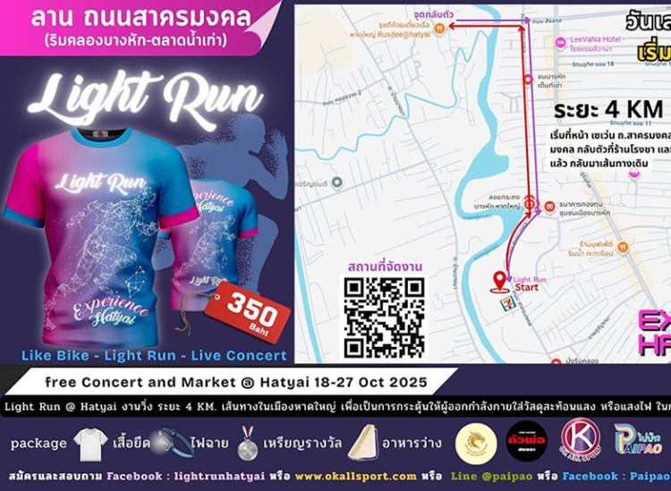 สงขลา - Light run @Hatyai กลับมาอีกครั้ง https://forms.gle/7iWoS7LFtEZANWsn7 เจอกันวันที่ 18 ตุลาคม 2568 ณ ลานถนนสาครมงคล (ริมคลองบางหัก-ตลาดน้ำเก่า) อ.หาดใหญ่ จ.สงขลา https://maps.app.goo.gl/5Q2ePNt1cY9rZoNJ9