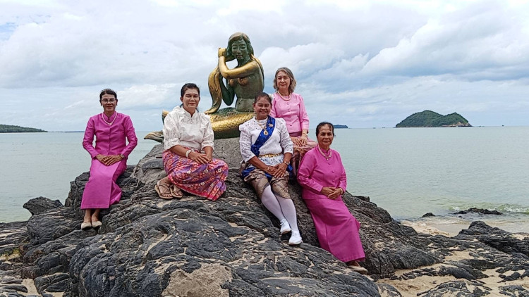 สงขลา-ชมรมสภาวัฒนธรรมตำบลเขารูปช้าง นำสมาชิกแต่งชุดไทยหลายสมัย ถ่ายภาพกับนางเงือกทองแห่งหาดสมิหลา และป้อมเมืองสัญลักษณ์ของเมืองสงขลา ส่งเสริมการท่องเที่ยววิถีไทย